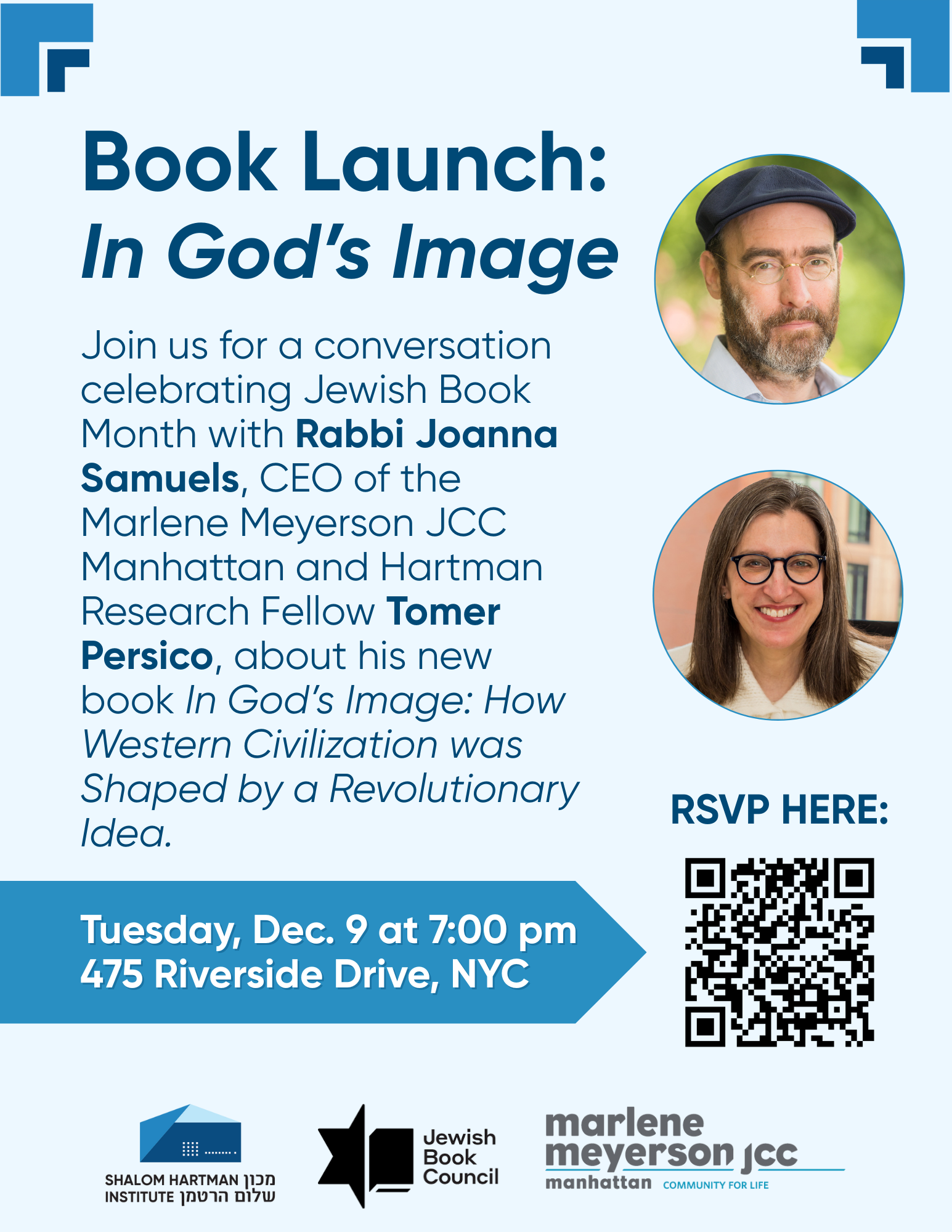 Join us for a conversation celebrating Jewish Book Month with Rabbi Joanna Samuels, CEO of the Marlene Meyerson JCC Manhattan, and author and Hartman research fellow Tomer Persico, about his new book In God’s Image: How Western Civilization Was Shaped by a Revolutionary Idea.