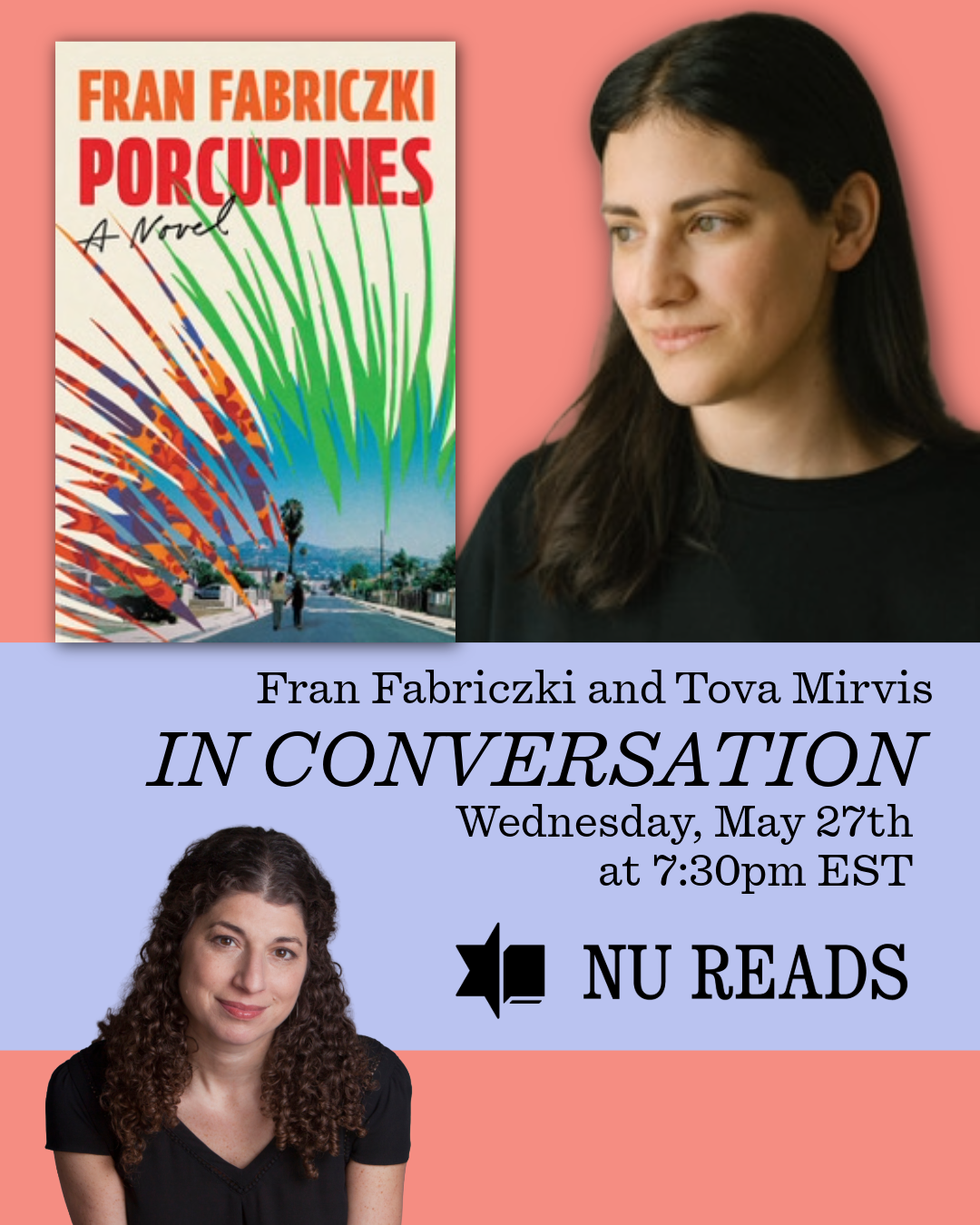 Event Nu Reads Community Conversation: Fran Fabriczki with Tova Mirvis Wednesday, May 27, 2026 7:30–8:30pm Virtual
