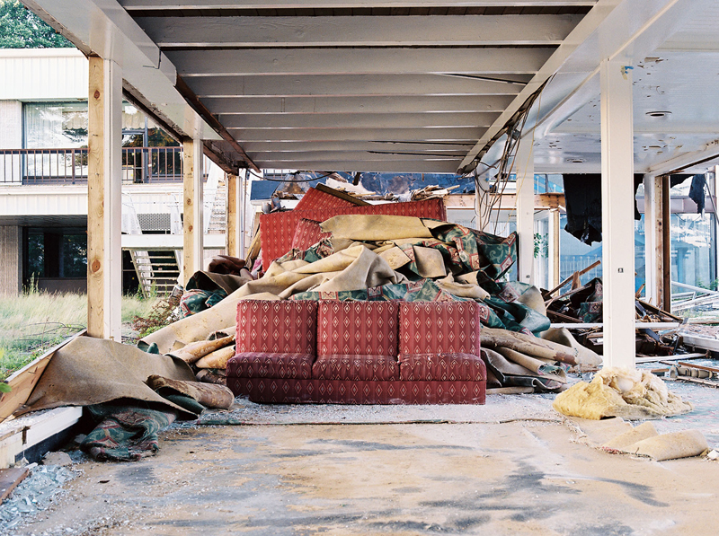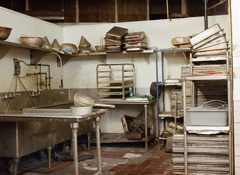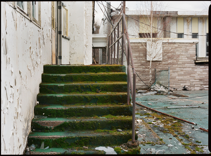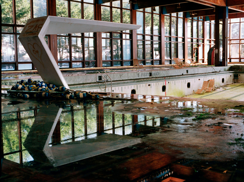 The Borscht Belt: Revisiting the Remains of America’s Jewish Vacationland begins with postcards of the Borscht Belt era in its prime and then delves into the photographic series at large. The first pages of it reveal an external view of an overgrown entrance to Grossinger’s and then by the third or fourth photograph the viewer is led inside. Then, like a journey, one is led into a lobby, through a showroom and outside to an Olympic sized swimming pool, revisiting the vestiges of a paradise that is now long gone. Other photographs convey the cycle of life or current activity occurring in the spaces such as a bird living in a guestroom, stacked pots and pans in a kitchen, a flight of steps supporting a combination of AstroTurf and moss, or a rotary phone lying a bed, off the hook. Each scenario is exactly how I found it, arranged not by myself but by time and chance.