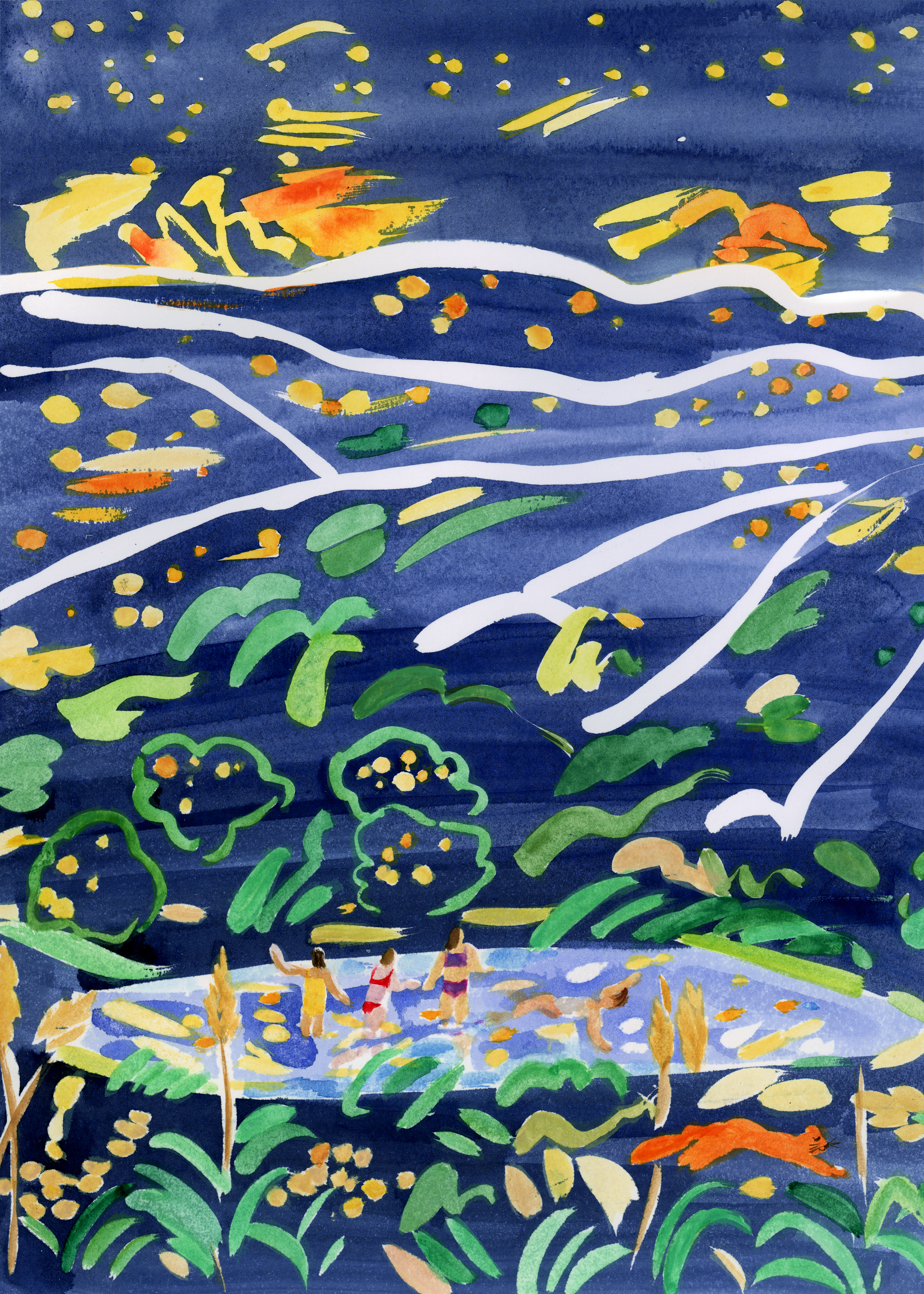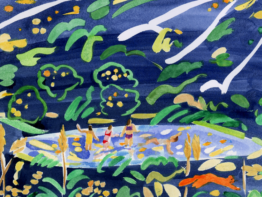 The next day, they slip out of camp just as Free Time begins. They follow the fire trail behind Girls’ Side and then the singletrack cutting up the mountain. They hike to the base of Marnie’s waterfall and count the tadpoles skittering in the sepia-toned shallows. They cup their hands over the frogs until the girls can no longer stand the wet tickle on their palms. They take turns watching the waterfall drip at different angles. They are delighted by the colors flitting through
