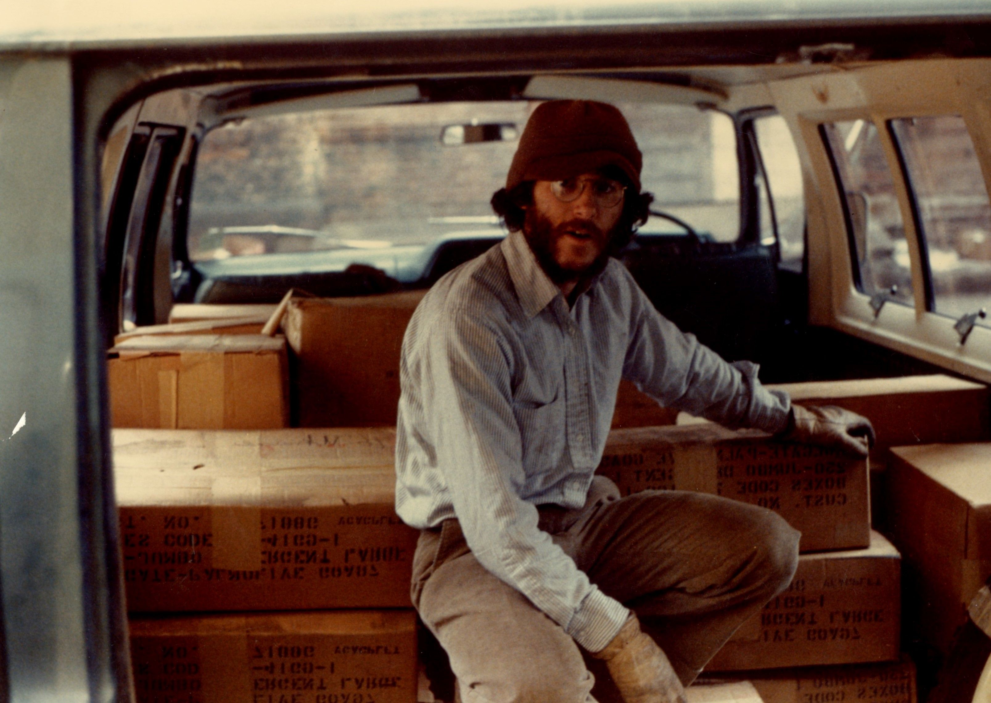Aaron Lansky in the truck with boxes of rescued books. Image courtesy of the Yiddish Book Center, Amherst, MA